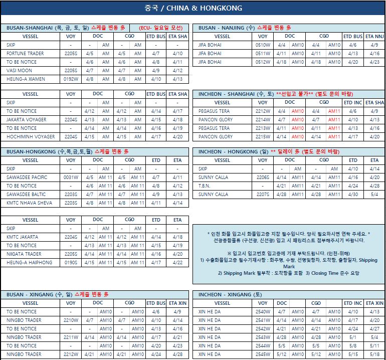 ▣ 기타지역, 항공, FCL 화물의 스케줄은 이메일 또는 전화로 문의주십시오
