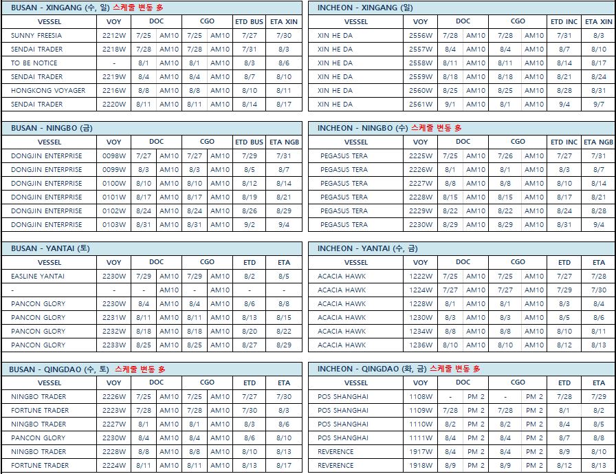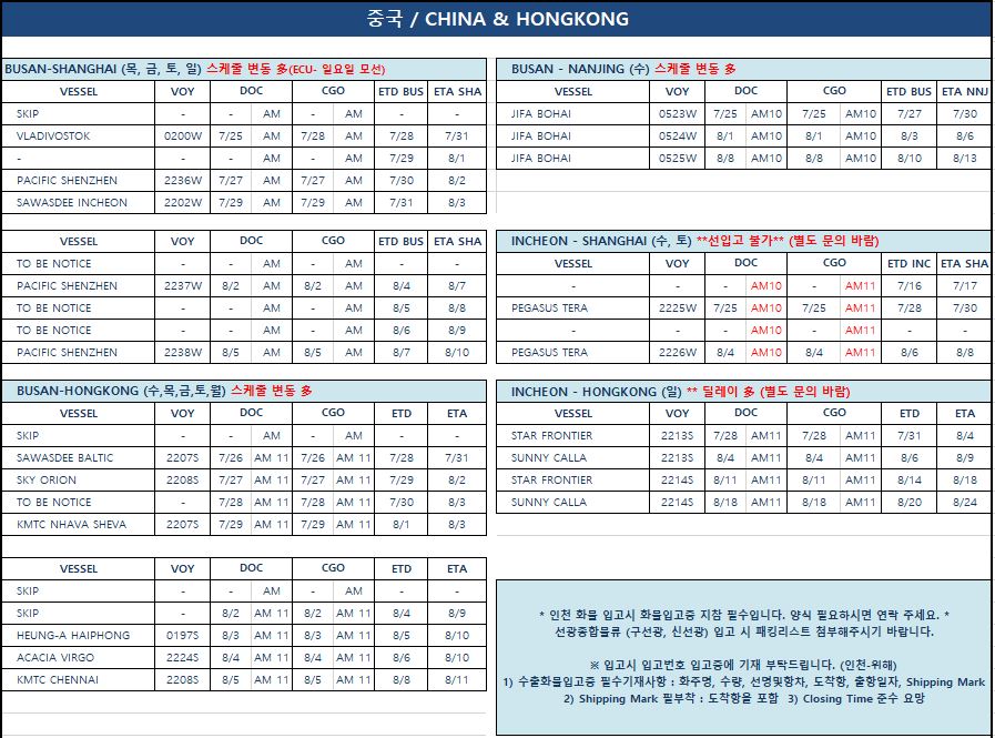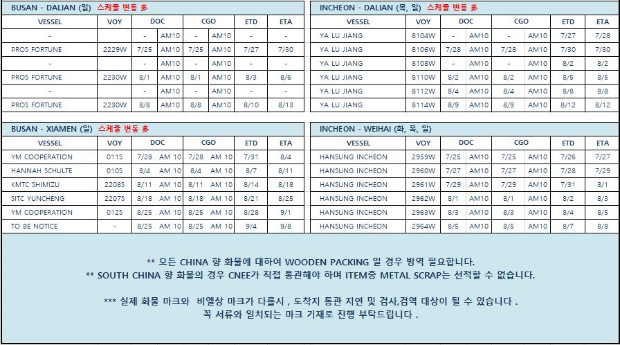 ▣ 기타지역, 항공, FCL 화물의 스케줄은 이메일 또는 전화로 문의주십시오